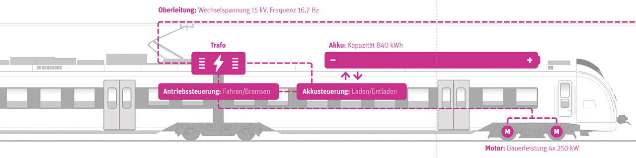 Die neuen Züge laden ihre auf dem Dach befindlichen Akkumulatoren (Kapazität: 840 kWh) während des Halts im Chemnitzer Hauptbahnhof und Leipziger Hauptbahnhof über die Oberleitung mit ihren Stromabnehmern auf. Sie fahren leise, bequem und umweltfreundlich.