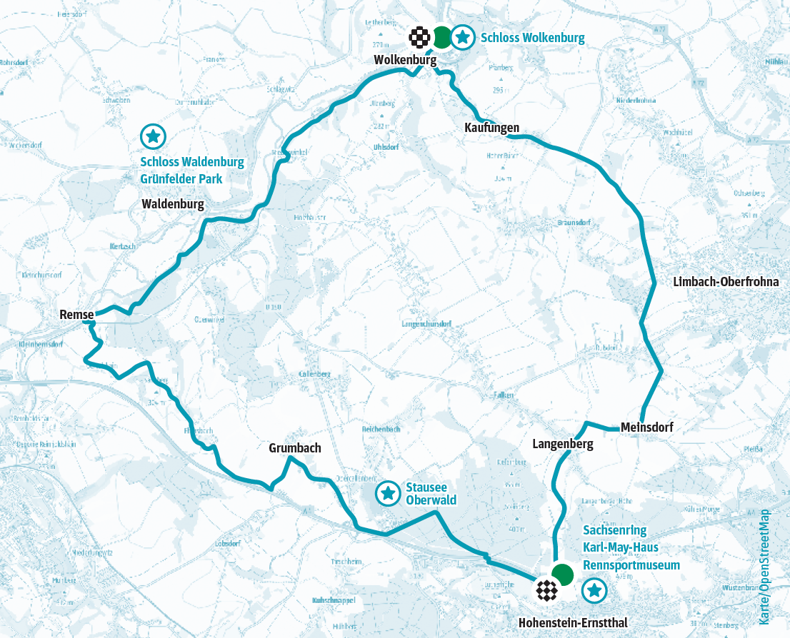 Los gehts in Wolkenburg. Das Schloss grüßt vom Hügel, und die Zwickauer Mulde fließt ruhig vorbei. Über Kaufungen rollen Sie nach Limbach-Oberfrohna: erst entspannt, dann flott weiter nach Hohenstein-Ernstthal. Hier brummt nicht nur der Sachsenring. Zwischen Trabi-Ikonen und Textilgeschichte im Textil- und Rennsportmuseum gibts auch das Karl-May-Haus zu entdecken. Nach diesem Schlenker durch Kultur und Kurven wartet Natur pur:
