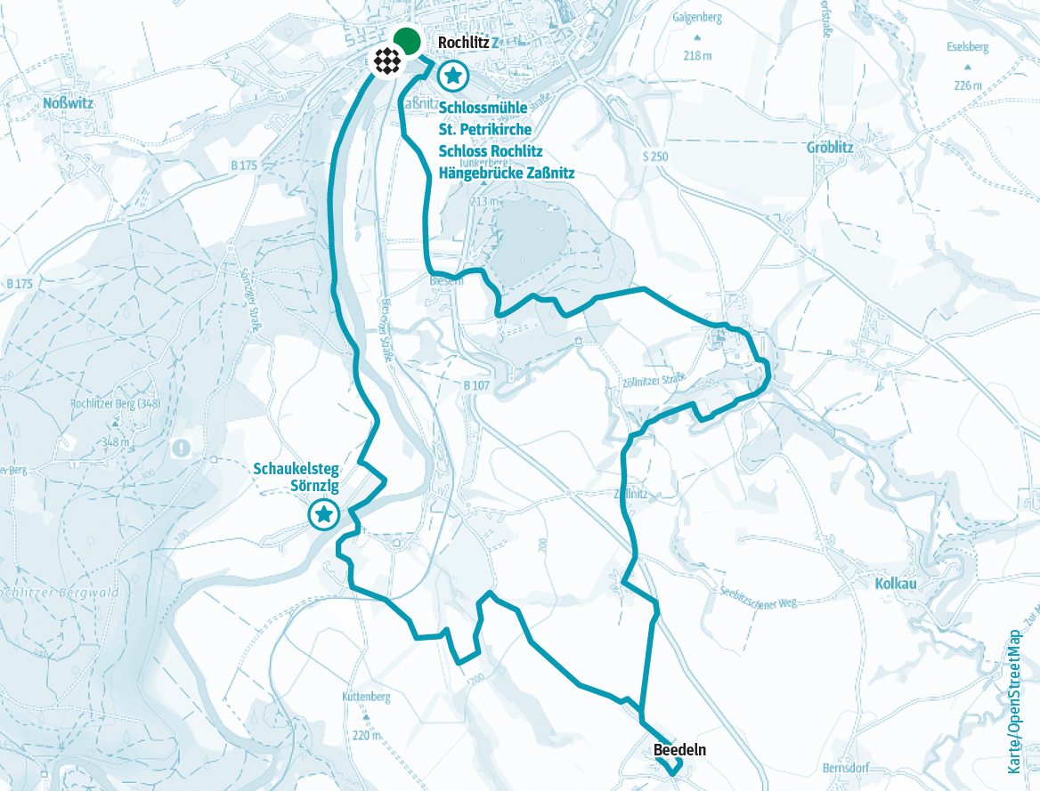 Dörfer wie Beedeln überraschen mit einem geschlossenen Rundlingsdorf, das fast aus der Zeit gefallen scheint. Kunsthöfe, Mühlen, eine spätgotische Kirche und ein Hauch Mystik begleiten Sie zurück nach Rochlitz mit einem Finale auf der Hängebrücke in Zaßnitz. Von dort liegt Ihnen nicht nur das Schloss Rochlitz, sondern auch das Muldental zu Füßen.